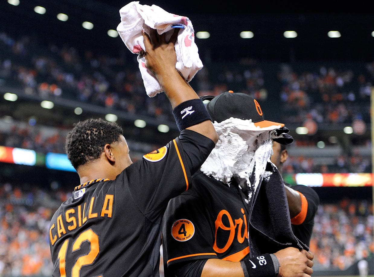 Alexi Casilla and Adam Jones pie Chris Dickerson :: Greg Fiume/Getty Images May 31, 2013