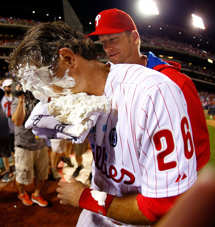 A.J. Burnett pies Chase Utley :: Rich Schultz/Getty Images June 26, 2014