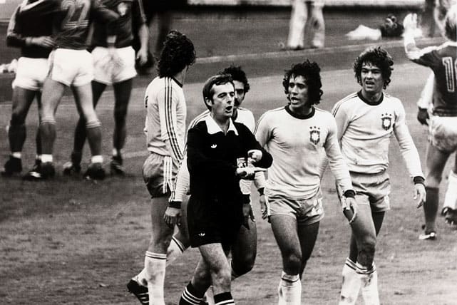 In a 1-1 game, ref Clive Thomas disallows a would-be game-winning goal by Brazil's Zico after a controversial incident when he blew his whistle for full time with the ball in the net. Arguments raged afterwards and it was claimed the ball was in mid-air when the whistle actually was heard.